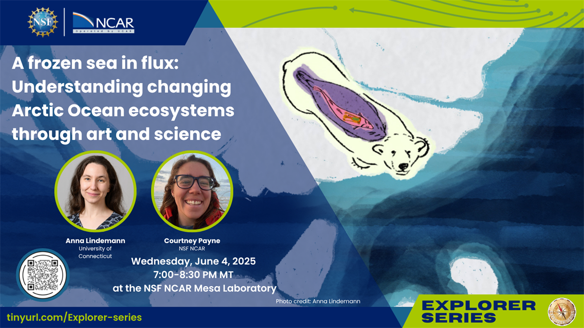 On Wednesday, June 4 from 7:00 pm - 8:30 pm (MT), NSF NCAR welcomes scientist Courtney Payne and artist Anna Lindemann for a lecture, "A frozen sea in flux: Understanding changing Arctic Ocean ecosystems through art and science." Register for the event to receive an email reminder and instructions on how to participate.